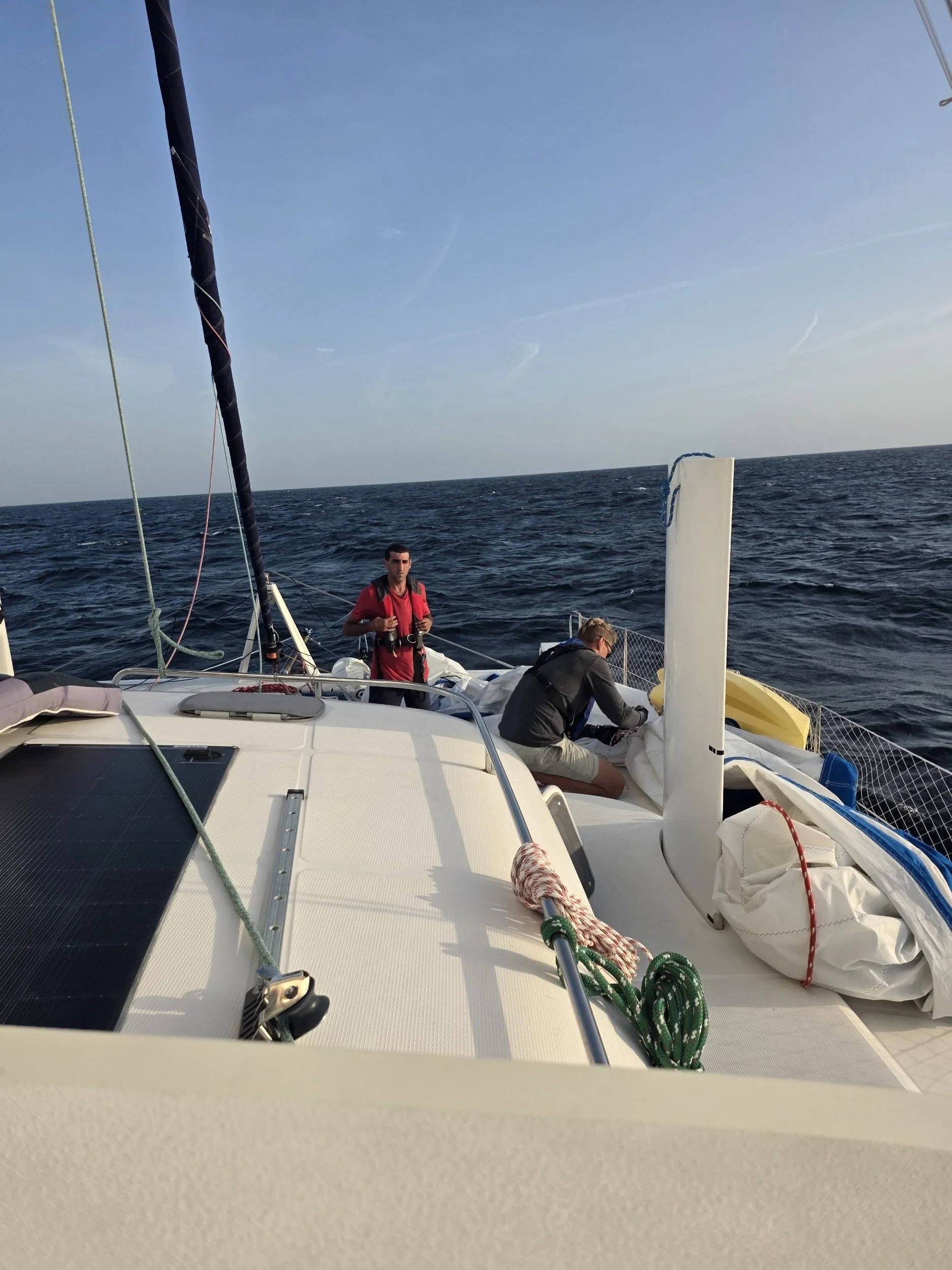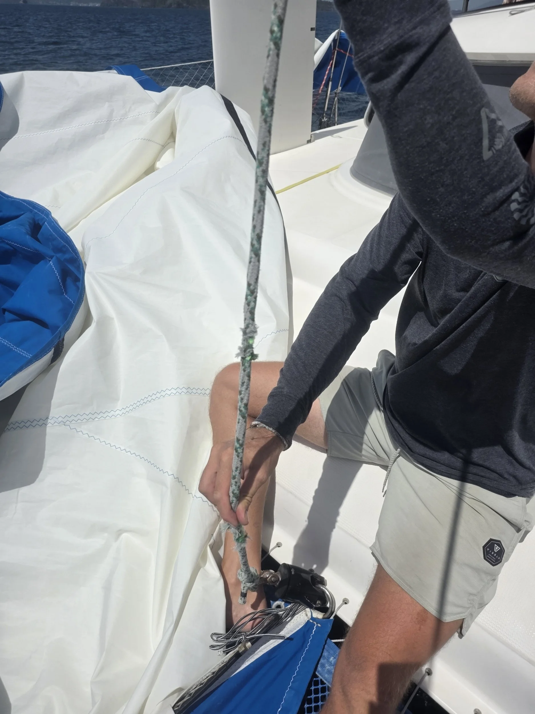 The screecher immediately chose violence. The swivel seized, it started unfurling was not happening the way it should. Adam realized it didn’t look right, it was twisted and saggy part way up and we couldn’t get it fully extended. The next thing you know Adam and Loïc are wrestling it down onto the deck like a rogue octopus. Adam unshackled the sail, where we also had some major chafe from the lack of rotation, due to the sized swivel on the screecher. So, he removed the chafe, thankfully just at the end of the line (cut it off). From there, he worked on the swivel…banged on it, used WD40, and who knows what else. It was a problem to solve later. We still had wind and wanted to sail.