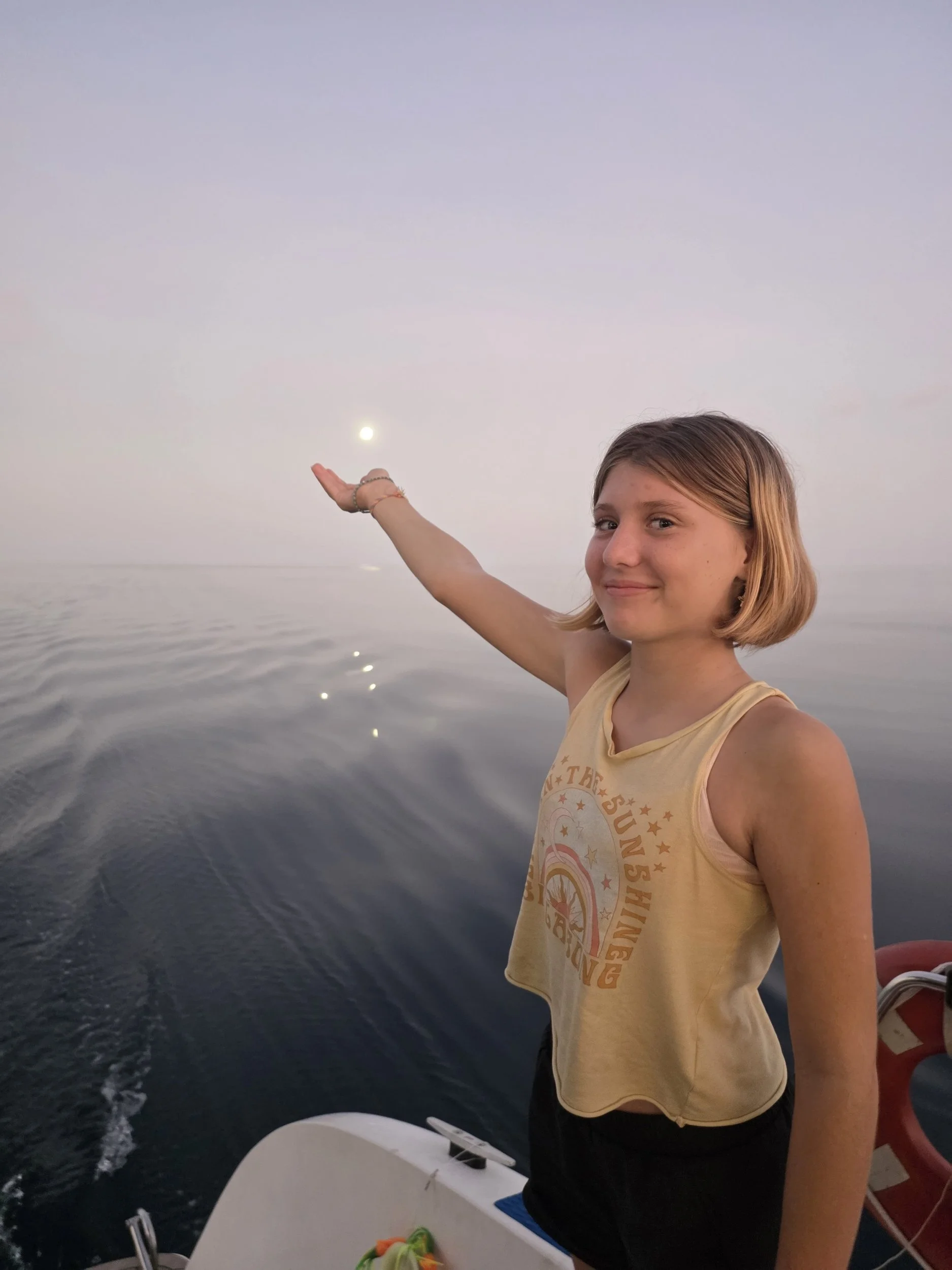 Aria begrudgingly rang the bell. Harbor and I tossed coins into the sea for Neptune. Thankfully, the ceremony got postponed until daylight (Neptune approved).