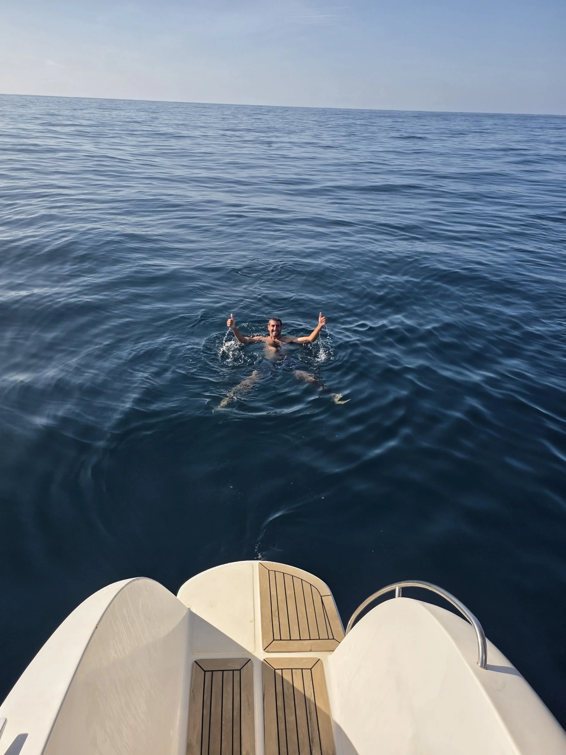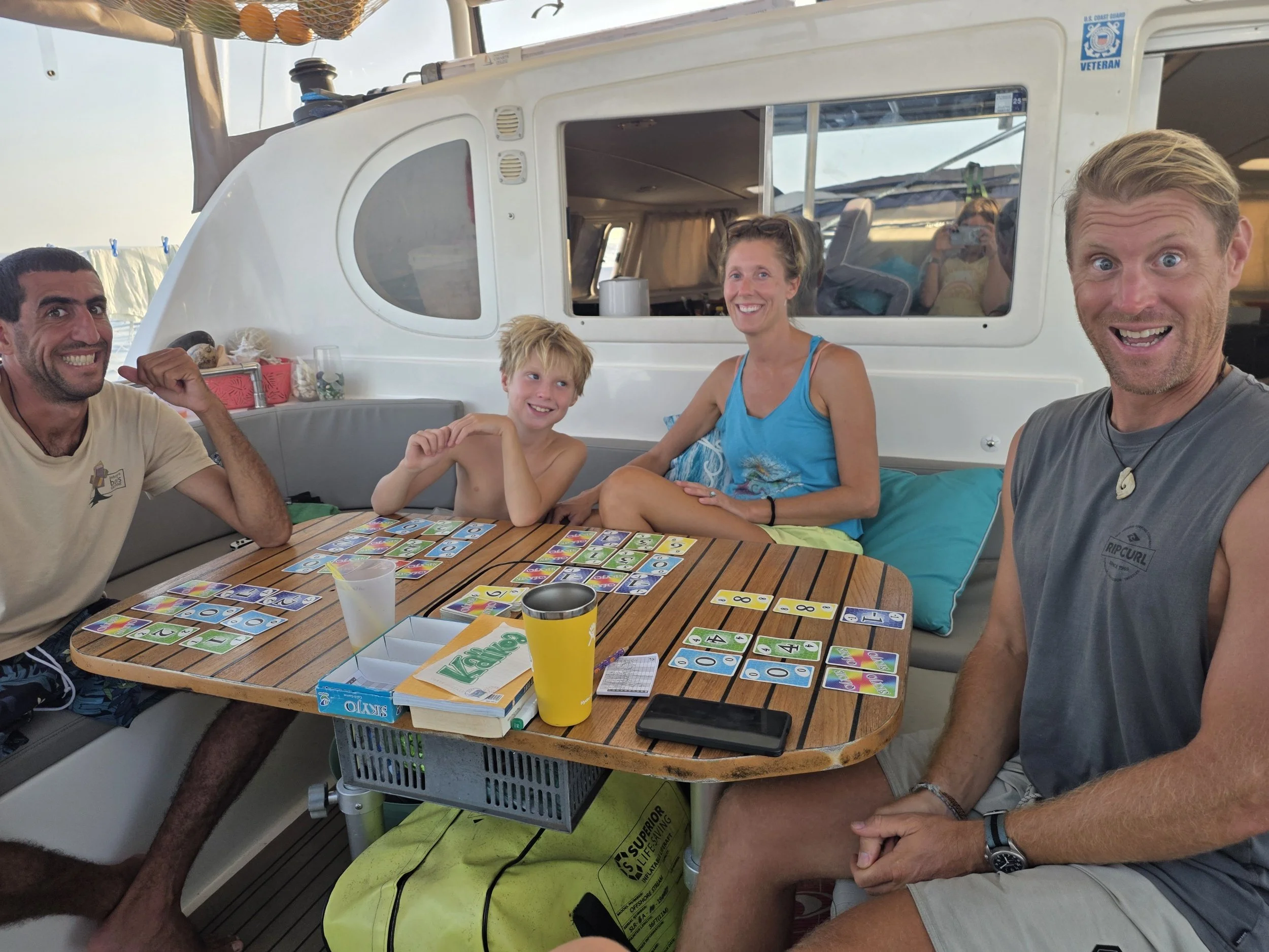 Naturally, everyone decided this was the perfect time for a swim. You also couldn’t have paid me to jump in. That is one of my worst nightmares (endless blue depths). Even with the stillness of the water, all I can imagine is Jaws coming in for a little taste! But Harbor Reef, whelp that guy was STOKED! Aria, Harbor, Loïc & Adam just jumped in without hesitation. I stood watch!