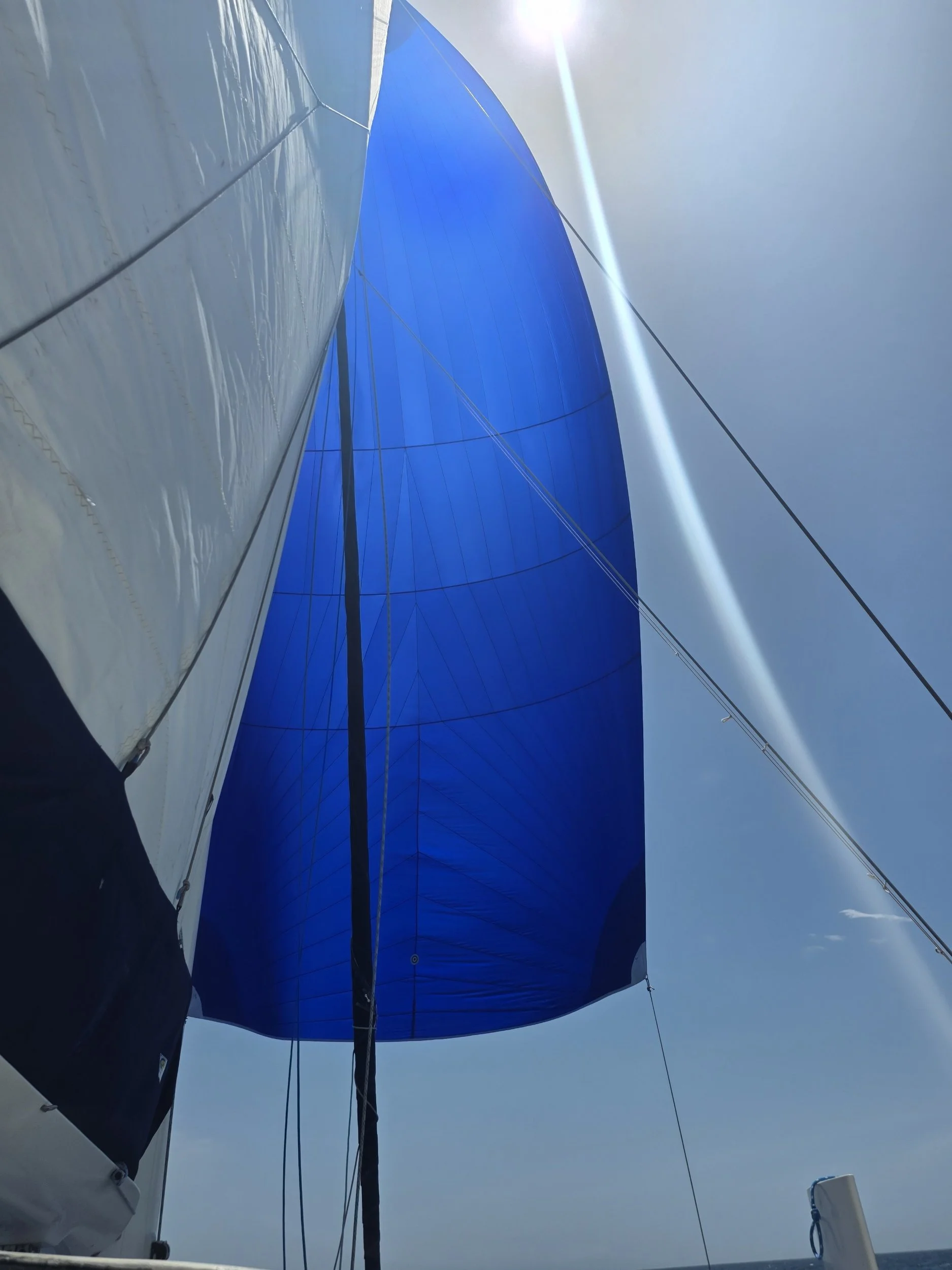 Cue the spinnaker! Up she goes, beautiful, flying like a dream…until the wind gets weird (as it does/because why NOT!), and we bring her down. Slightly less beautifully. She snagged and came down with a small 90-degree tear near the top (square inch in size), likely due to the seizing wire 😬.